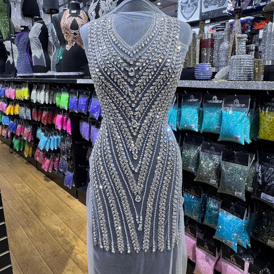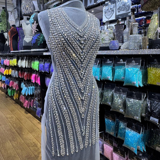 Rhinestone bodice applique made with glass rhinestones and beads.