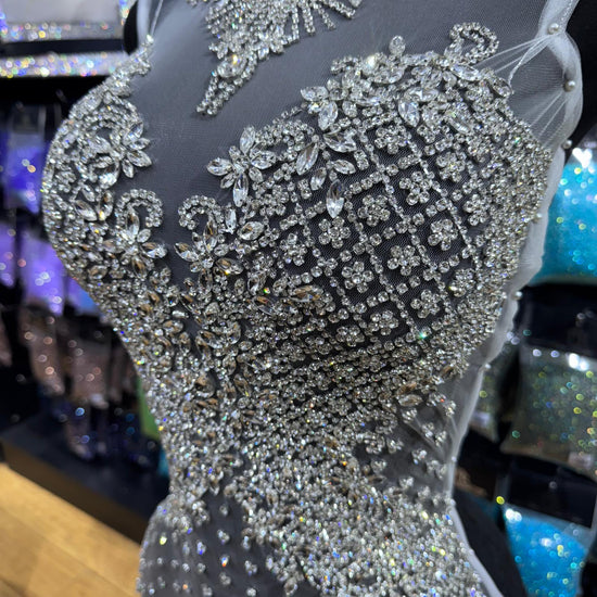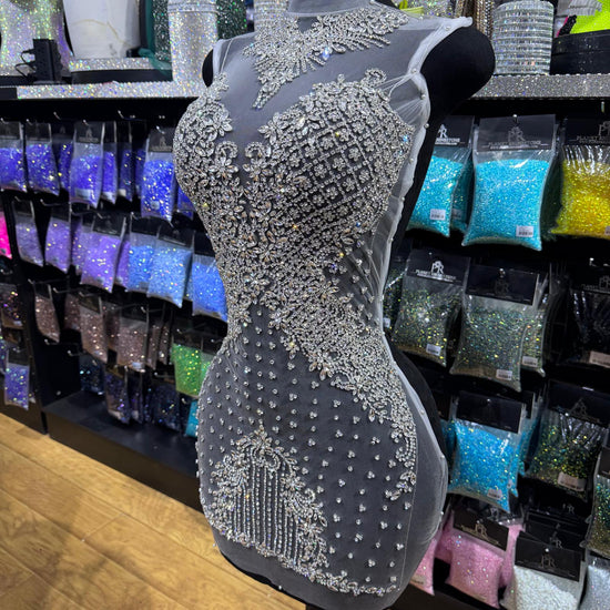 Rhinestone bodice applique made with glass rhinestones and beads.