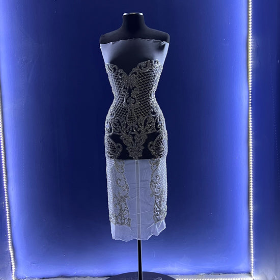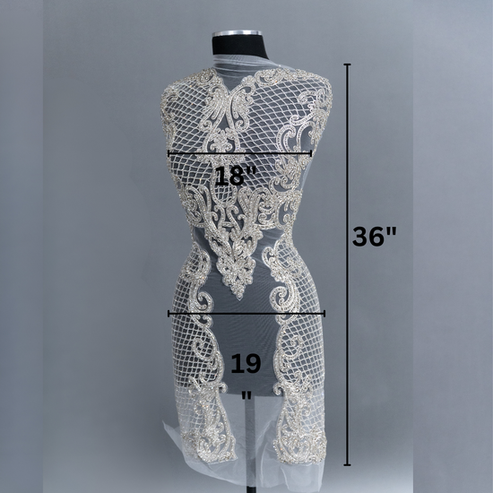 This one-piece bodice is attached to a mesh backing for easy use in DIY projects. Perfect for use on custom prom dresses, wedding and bridal dresses, formal dress occasions, and more.