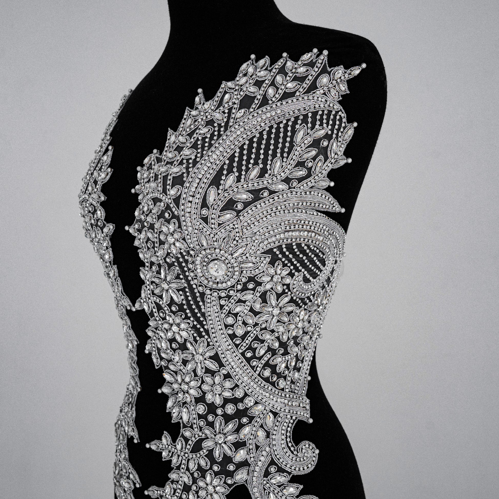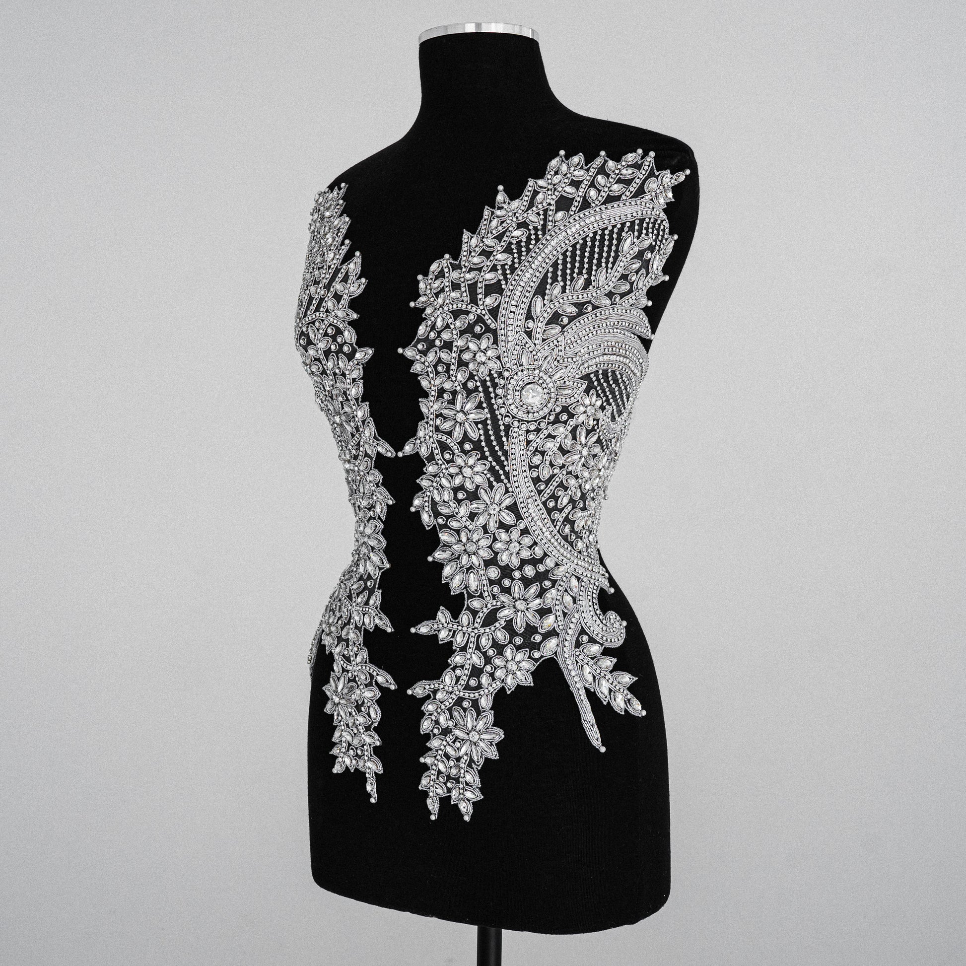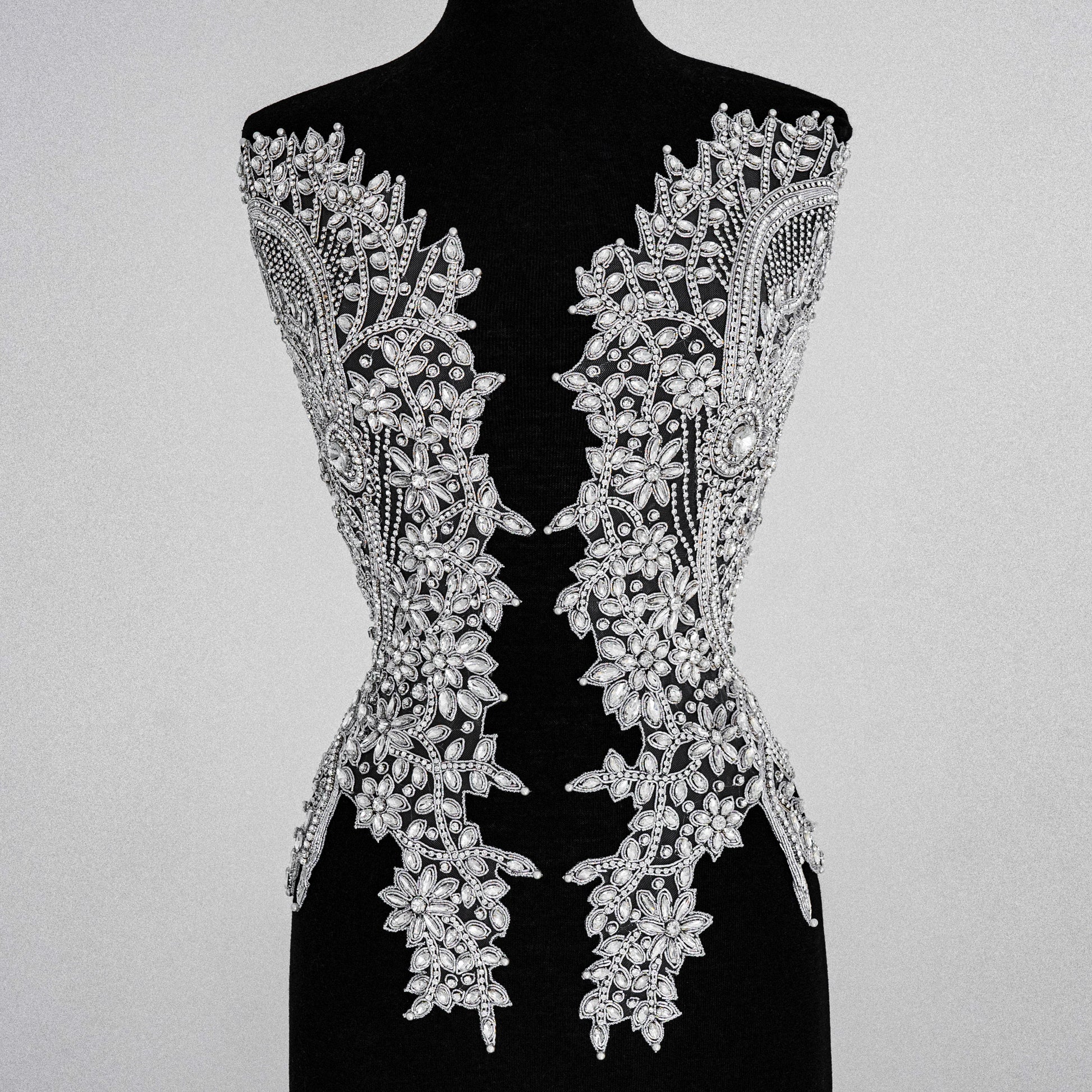 Beautiful beaded rhinestone bodice applique. This rhinestone applique is made with high-quality rhinestones in a gorgeous and lush design.
