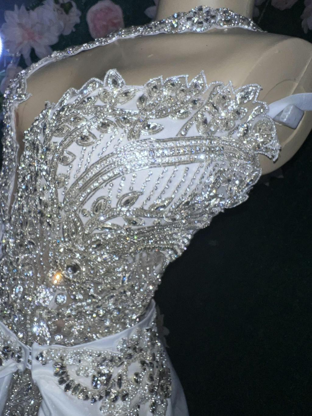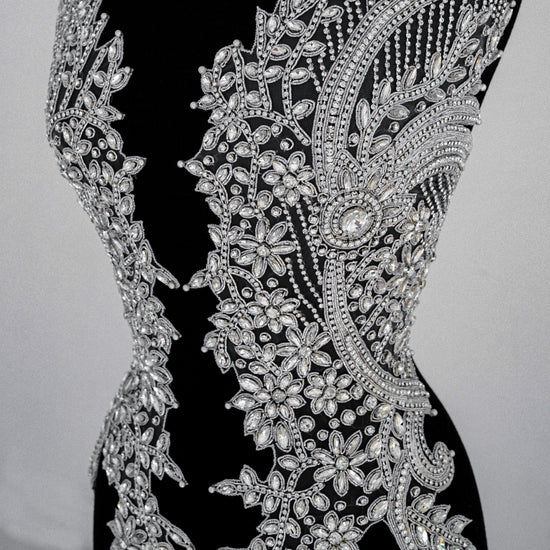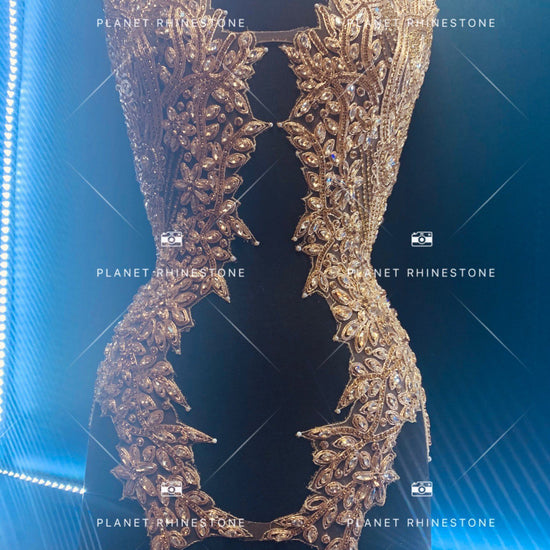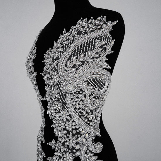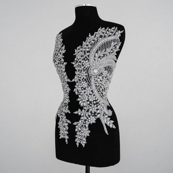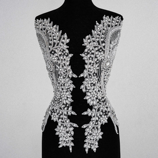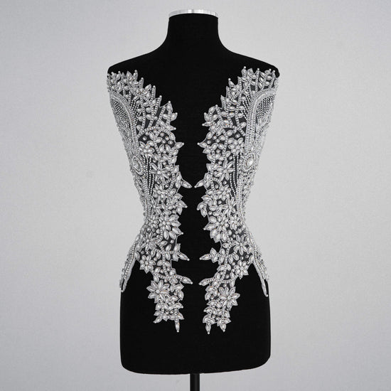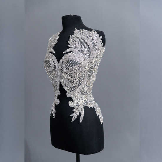 Beautiful beaded rhinestone bodice applique. This rhinestone applique is made with high-quality rhinestones in a gorgeous and lush design.