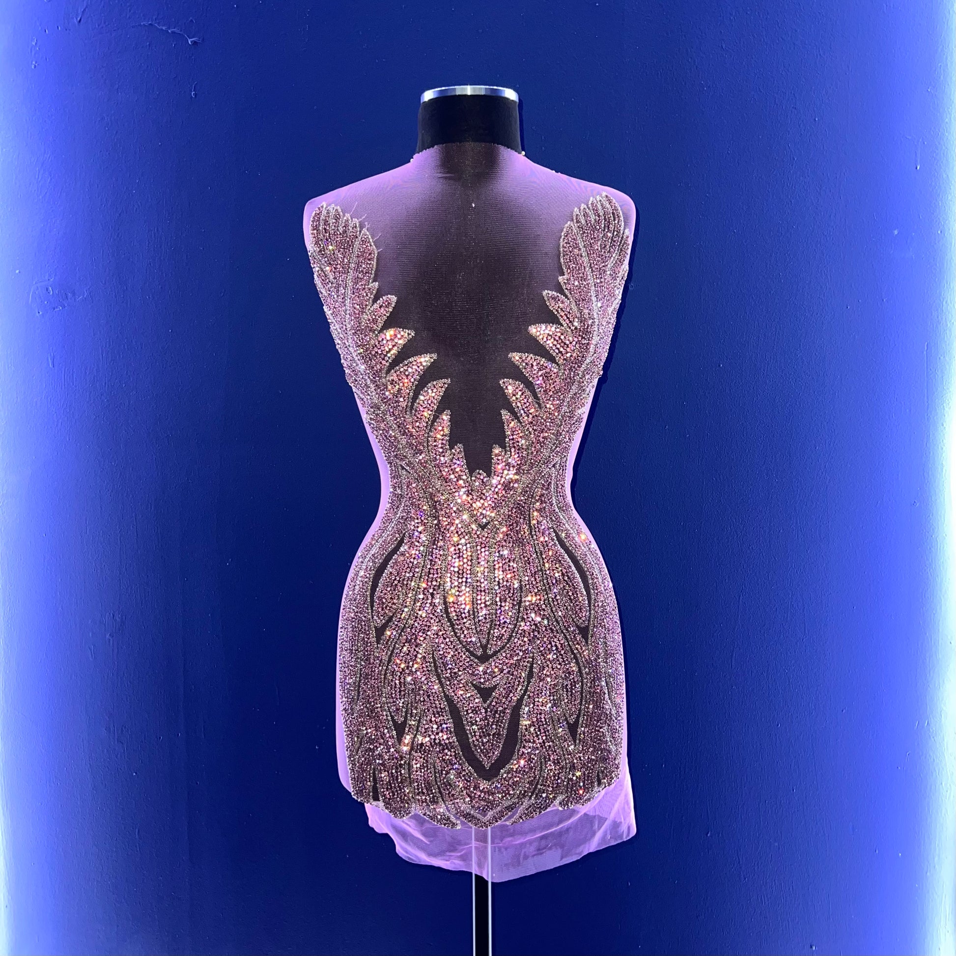 This beautiful applique is handmade with top quality Rhinestone beads. The applique is attached to a mesh backing to make it super easy for DIY projects. This applique can be used in many different styles and positions. What we have shown in the photo is our favorite look.