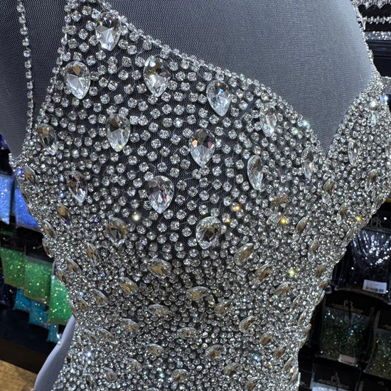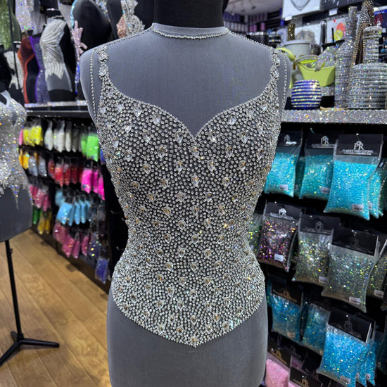 Rhinestone bodice applique made with glass rhinestones and beads.