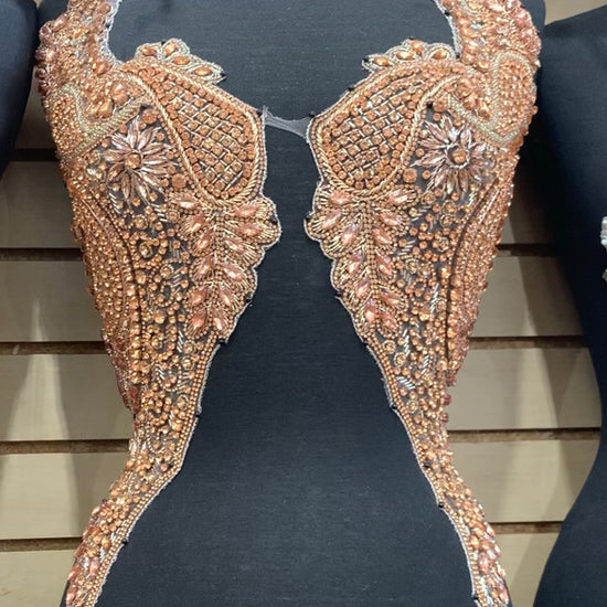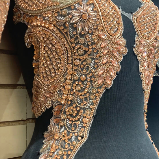 Beautiful beaded rhinestone bodice applique. This rhinestone applique is made with high-quality rhinestones in a gorgeous and lush design. This item comes in two pieces giving you a lot of flexibility with your design.