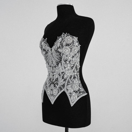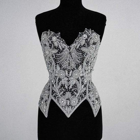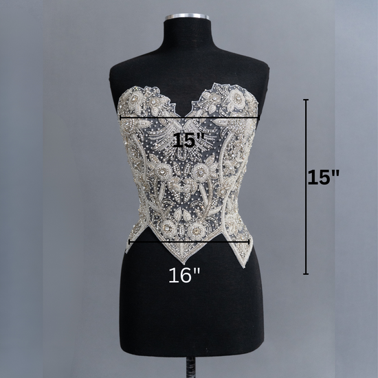 This beautiful applique is handmade with top quality Rhinestone beads. The applique is attached to a mesh backing to make it super easy for DIY projects. This applique can be used in many different styles and positions. What we have shown in the photo is our favorite look.