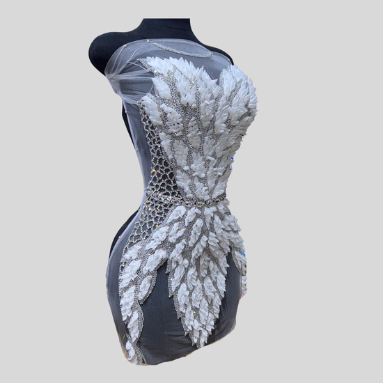 Cynthia is a hand-made rhinestone bodice appliqué featuring layered leaf-shaped embellishments for rich texture and dimension. Crafted with high-quality glass rhinestones and beads, this design combines sculpted sparkle with soft leaves. Set on sheer mesh for an illusion effect, Cynthia is a striking statement piece for stage, couture, and custom garments.
