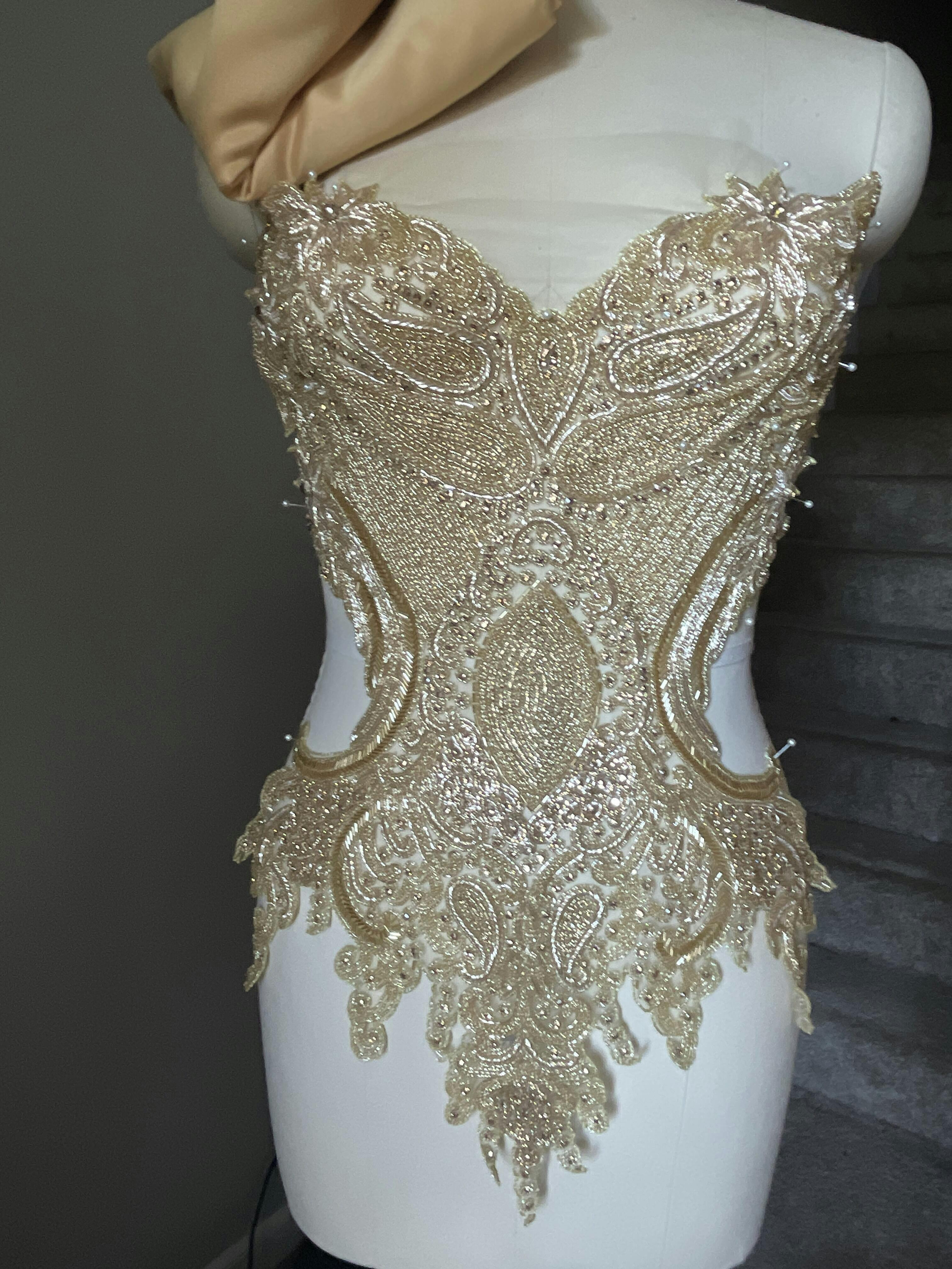 High-quality gold rhinestone bodice.
