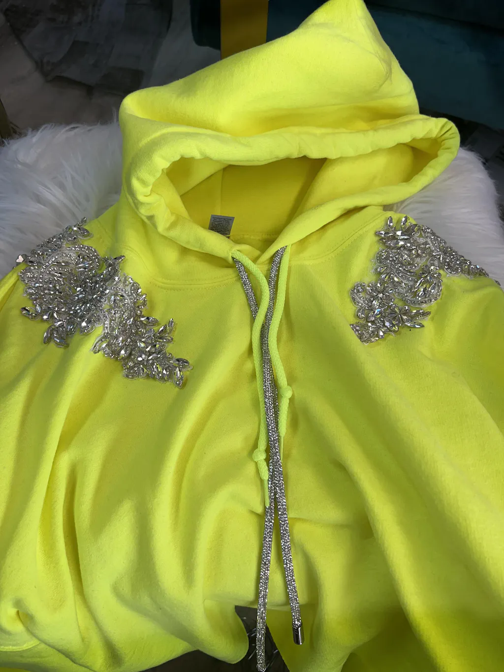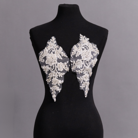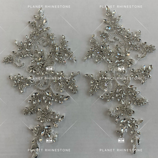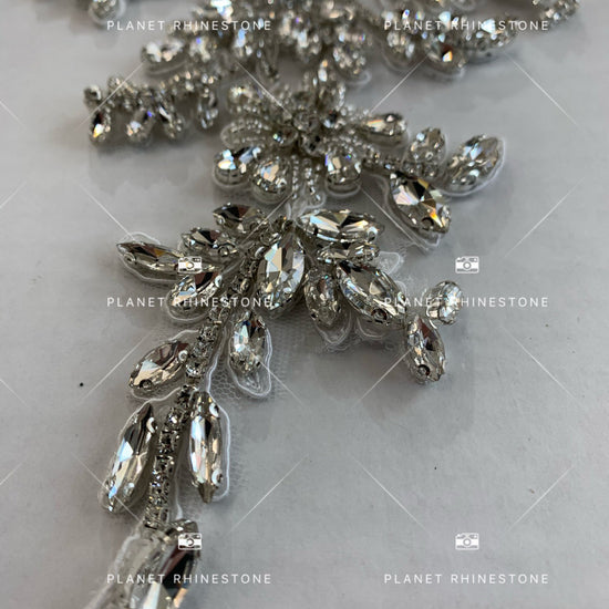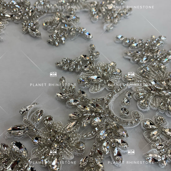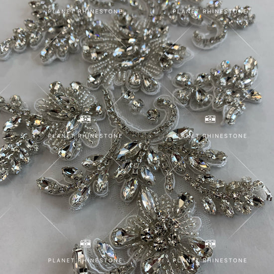 This beautiful applique is handmade with top-quality glass rhinestones and beads. The lace base allows for easy sewing for DIY projects. The applique can also easily be cut into smaller segments, with the use of scissors, for your own customized design.