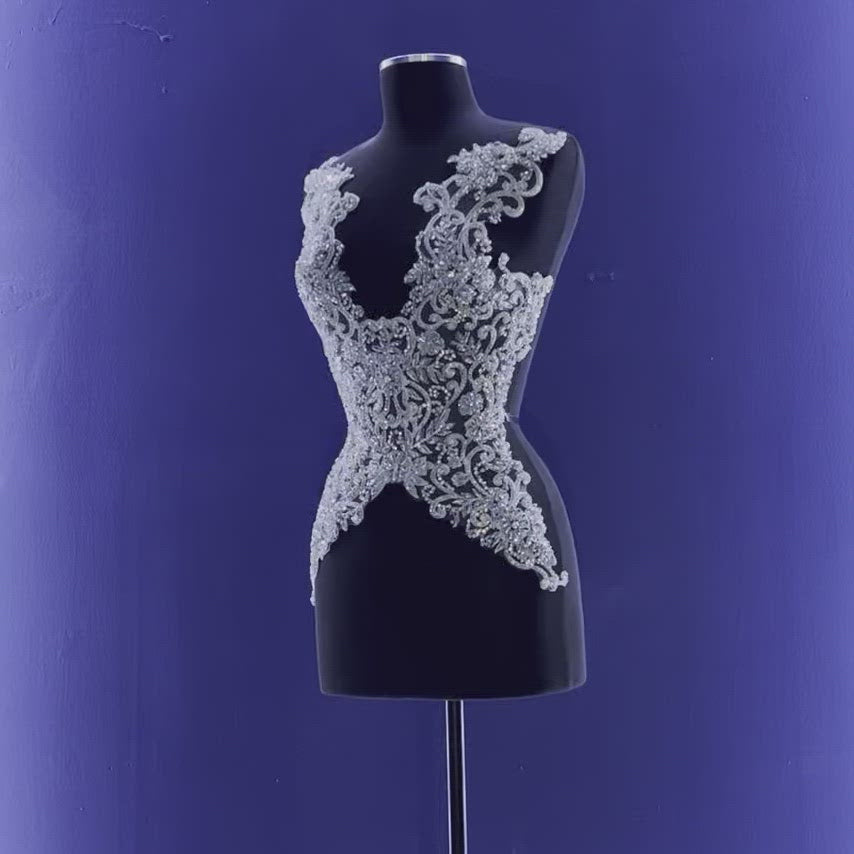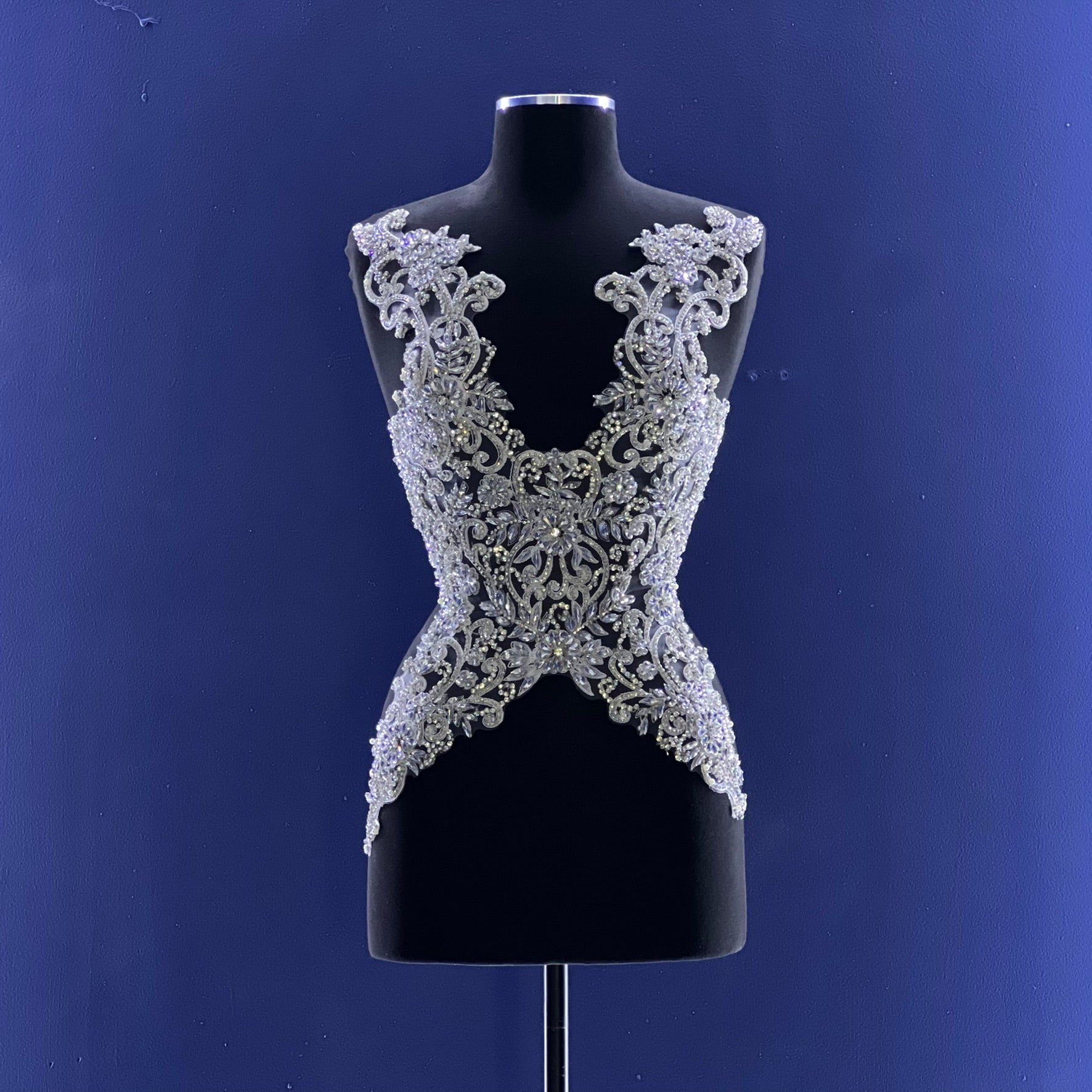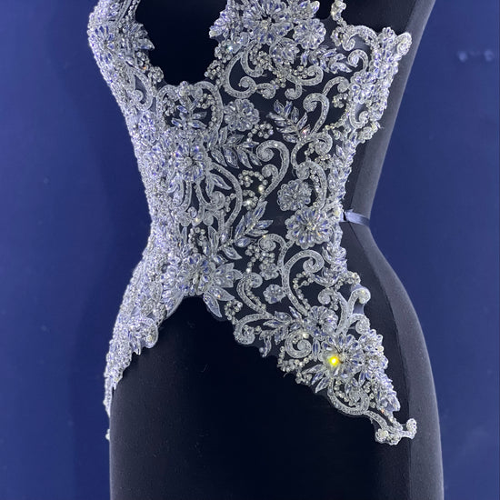 Beautiful handmade rhinestone bodice applique made with high-quality crystal rhinestones, beads, and white lace.