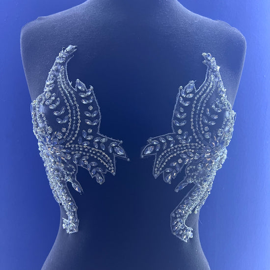 The Ester rhinestone applique is handmade with high-quality crystal glass rhinestones. The mesh base allows for easy sewing for DIY projects. The applique can also easily be cut into smaller segments, with the use of scissors, for your own customized design.