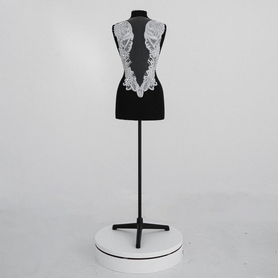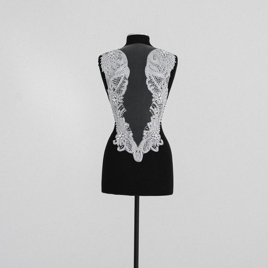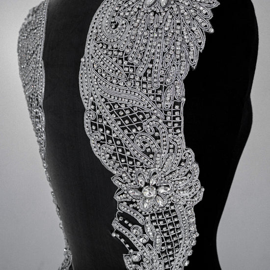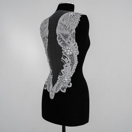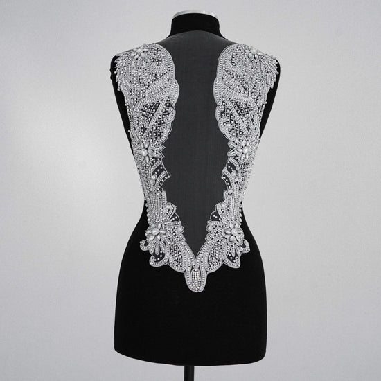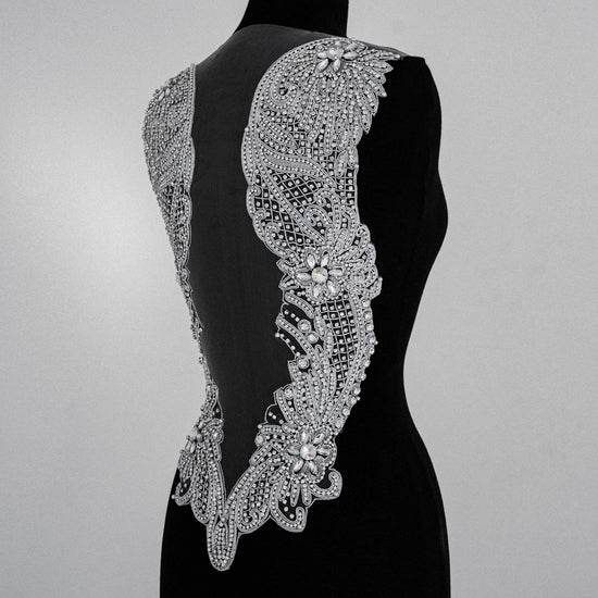 Beautiful beaded rhinestone bodice applique. This rhinestone applique is made with high-quality rhinestones in a gorgeous and lush design.