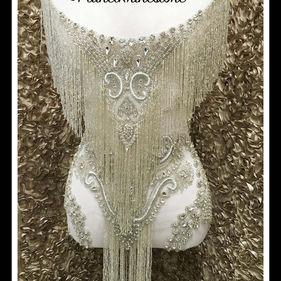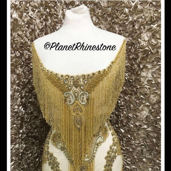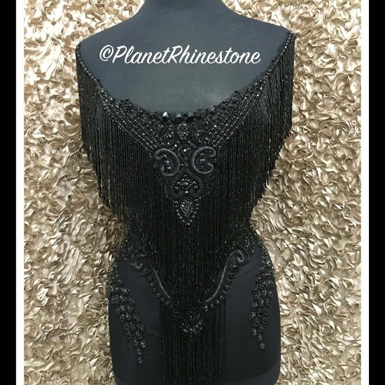 This beautiful applique is handmade with top quality glass rhinestones. The applique is attached to a mesh backing to make it super easy for DIY projects.