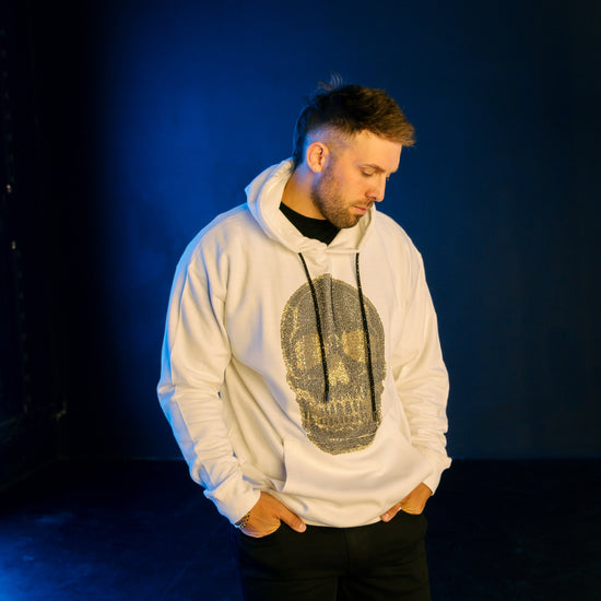PRODUCT DETAILS: Our unisex Golden Skull Hoodie features a large jet black/aurum glass rhinestone skull and a rhinestone hoodie drawstring.