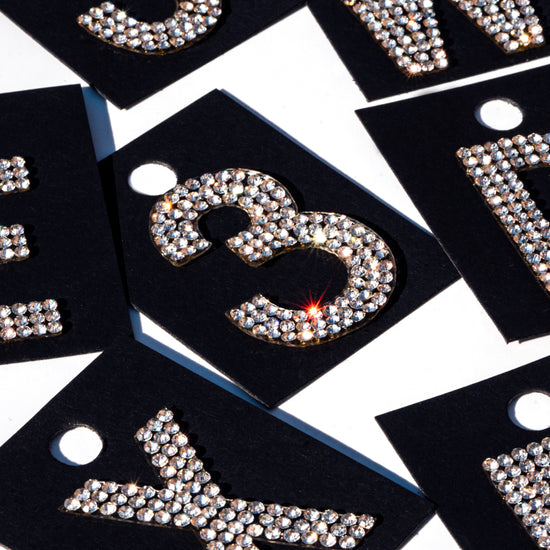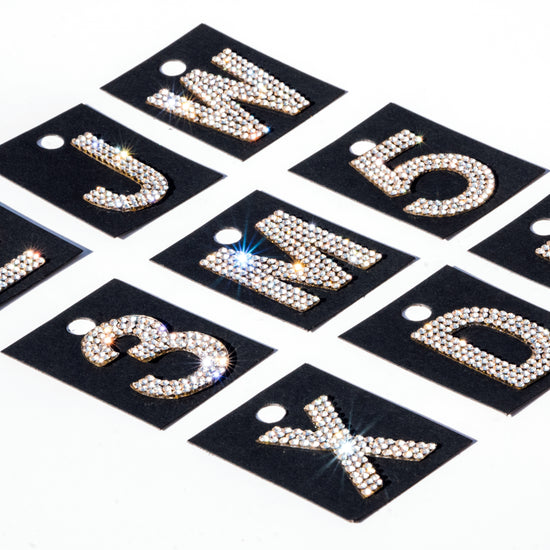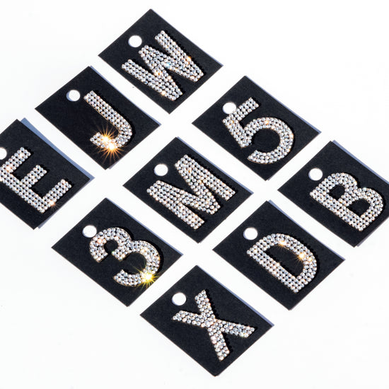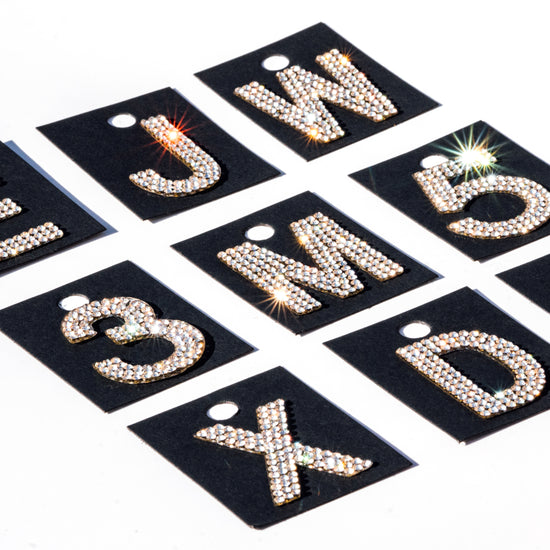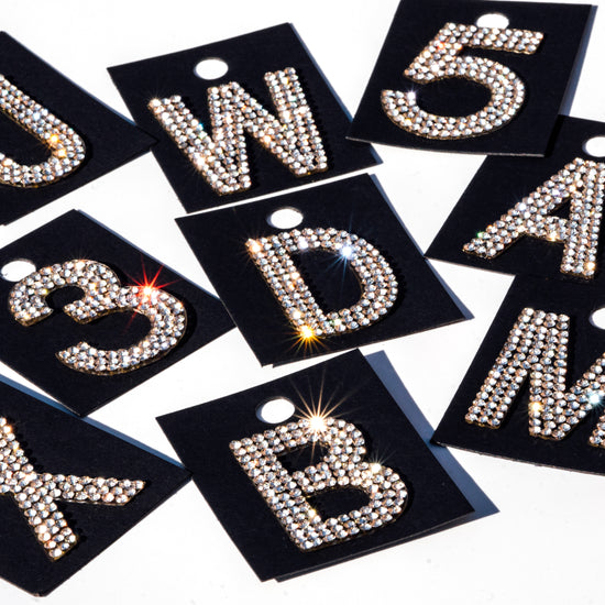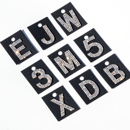 Hotfix iron-on letters, made with high-quality crystal rhinestones. Perfect for personalized projects and custom decals. Use on jackets, hats, hairpins, belts, wedding decor, hairbands, and more. All items are ready to ship!
