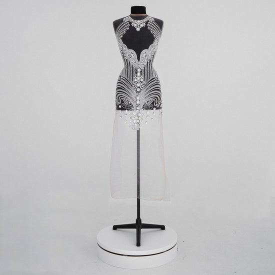 This one-piece bodice is attached to a nude mesh backing for easy use in DIY projects. Perfect for use on custom prom dresses, wedding and bridal dresses, formal dress occasions, and more.