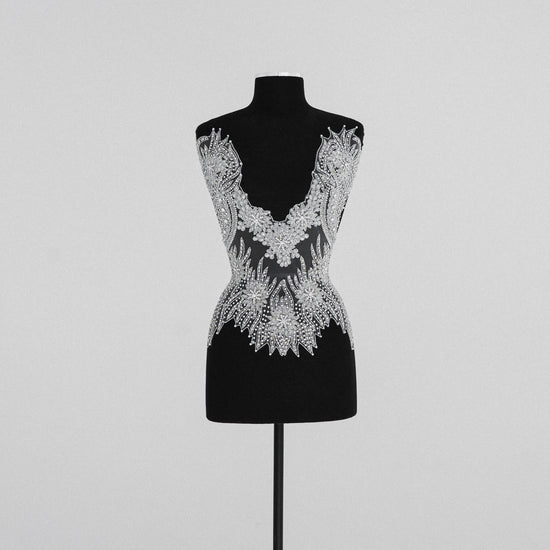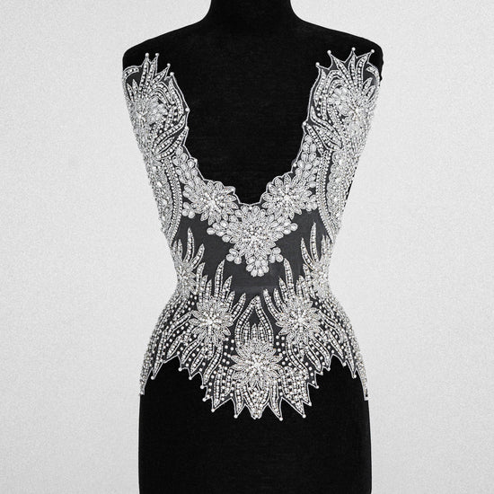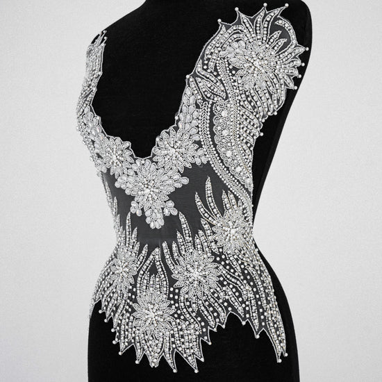 This bodice applique is attached to a mesh backing for easy use in DIY projects. Perfect for prom dresses, formal gowns, weddings and wedding dresses, and more.