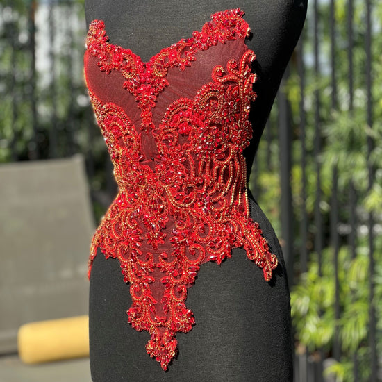 Beautiful handmade rhinestone bodice applique made with high-quality rhinestones and beads. Perfect for use on custom prom dresses, wedding and bridal dresses, fancy dress occasions, and more.