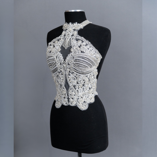 Rhinestone bodice applique made with glass rhinestones and beads.
