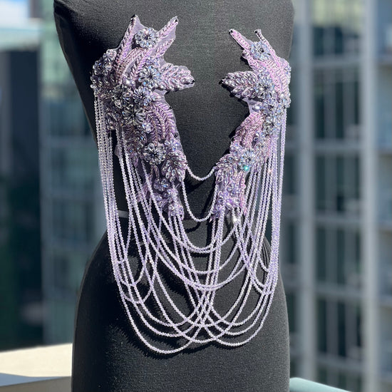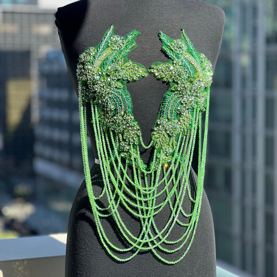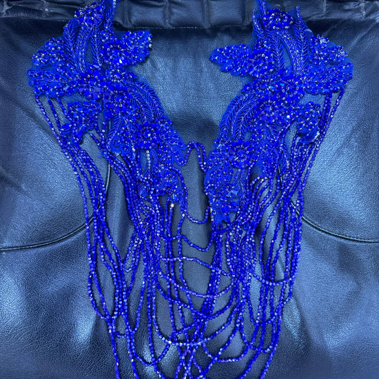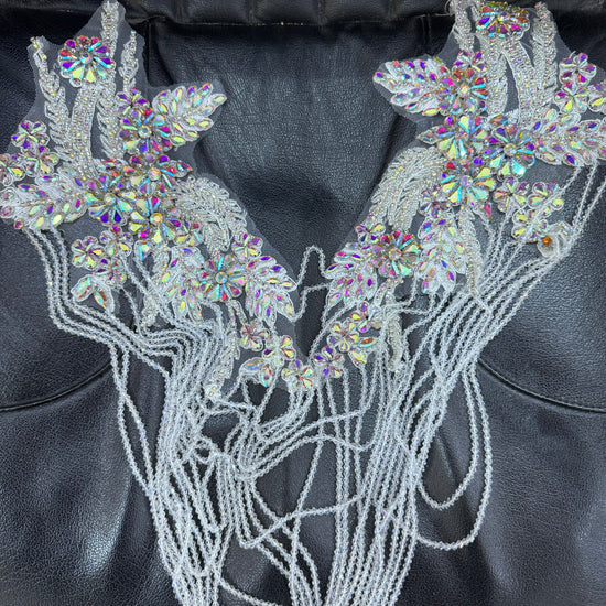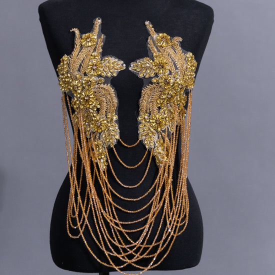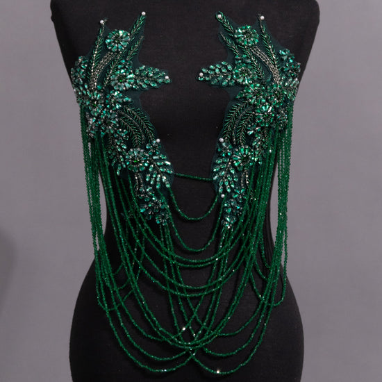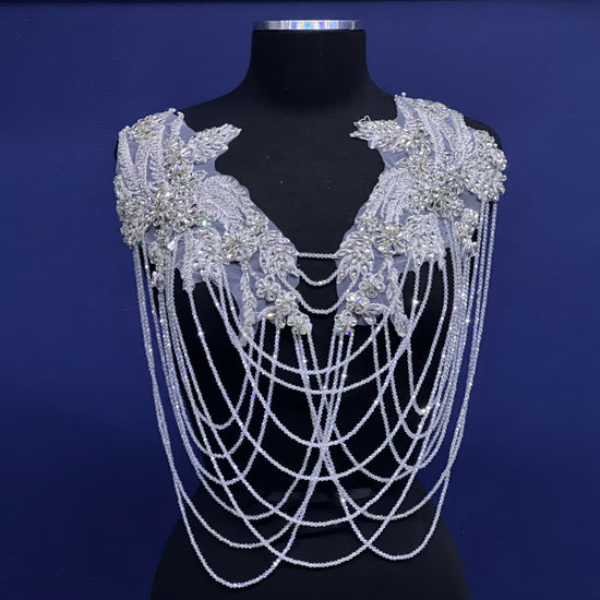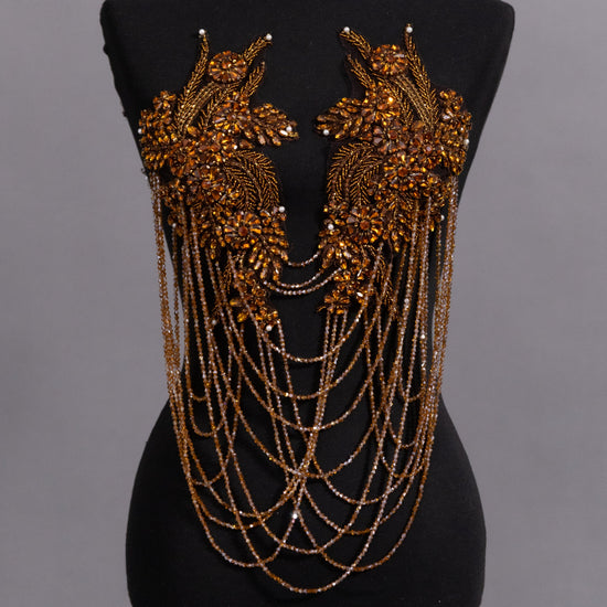 Jina 2.0 is handmade with glass beads and glass rhinestones. The two pieces are connected with strands of glass beads. If preferred, the strands of glass beads and but cut and used on other parts of the dress.