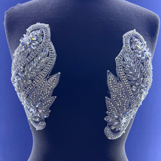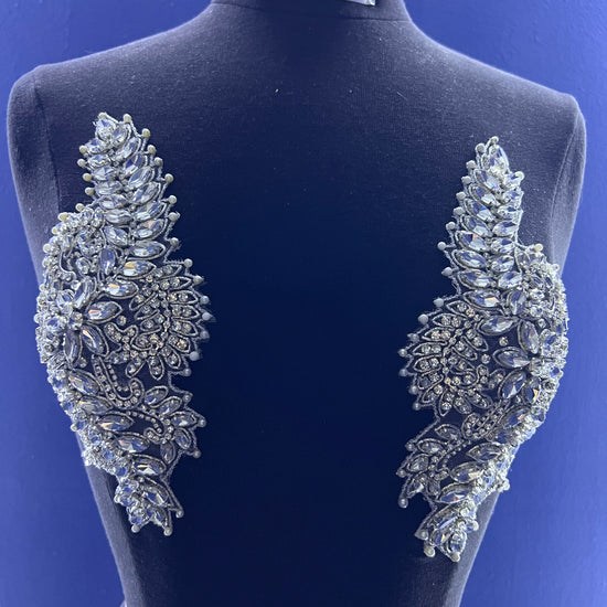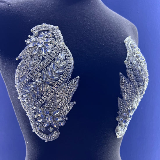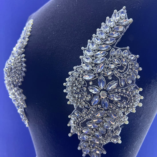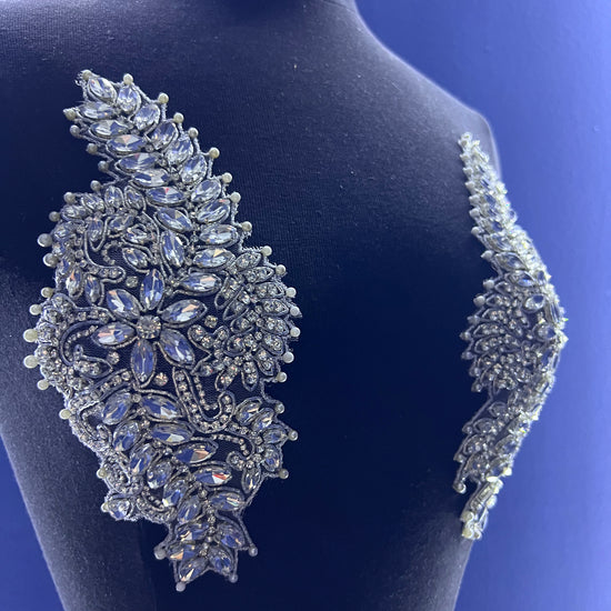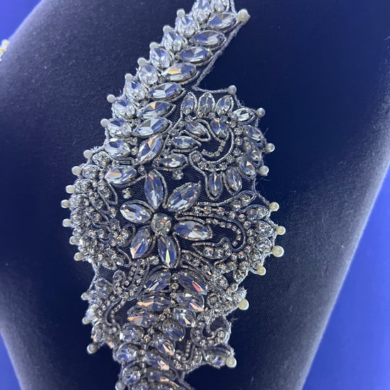 The Liz rhinestone applique is handmade with high-quality crystal glass rhinestones. The mesh base allows for easy sewing for DIY projects. The applique can also easily be cut into smaller segments, with the use of scissors, for your own customized design.