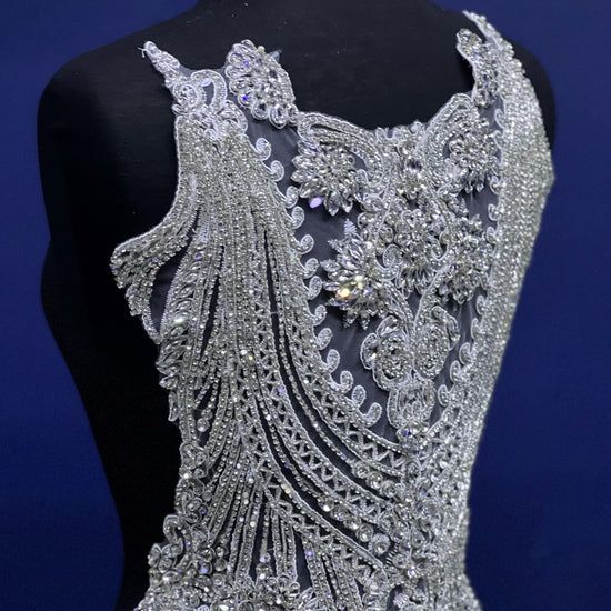Beautiful handmade rhinestone bodice applique made with high-quality rhinestones and beads. Perfect for use on custom prom dresses, wedding and bridal dresses, fancy dress occasions, and more.