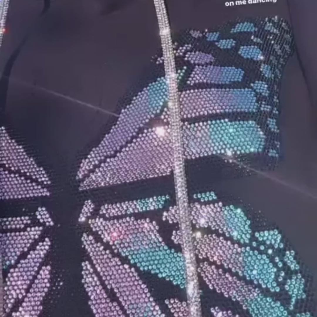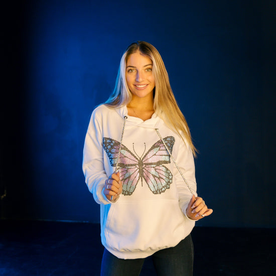 PRODUCT DETAILS: The Magical Butterfly Hoodie features a large butterfly design, made of Lt. Rose and aquamarine glass rhinestones. This hoodie comes with a rhinestone drawstring to complete the look.