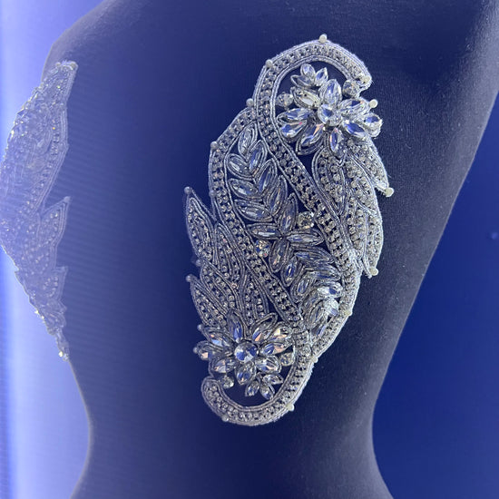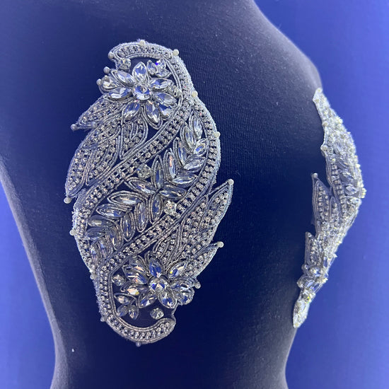 The Monica applique is handmade with high-quality crystal glass rhinestones. The mesh base allows for easy sewing for DIY projects. The applique can also easily be cut into smaller segments, with the use of scissors, for your own customized design.