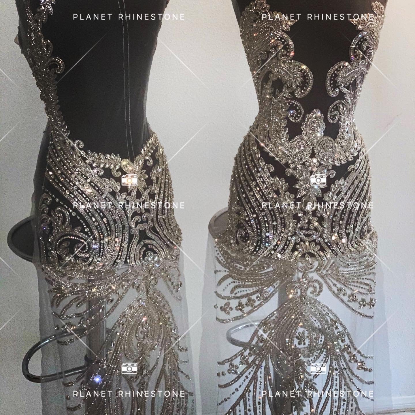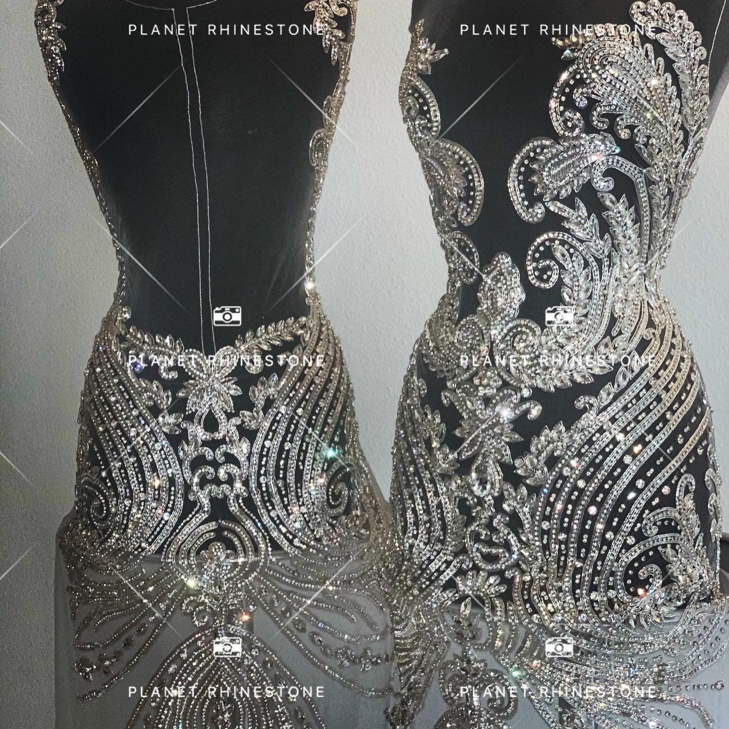 Beautiful beaded rhinestone bodice applique. This full-body applique is made with high-quality rhinestones in a gorgeous and lush design. This back and front set is attached to a mesh backing for easy use in DIY projects.