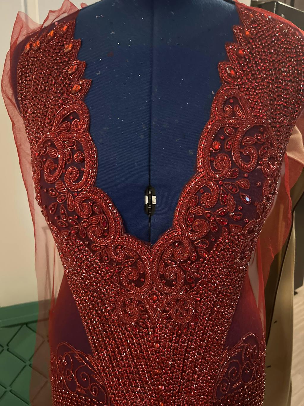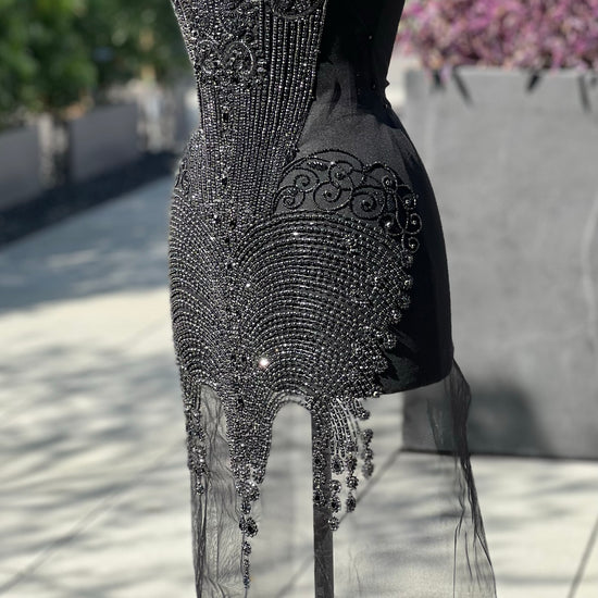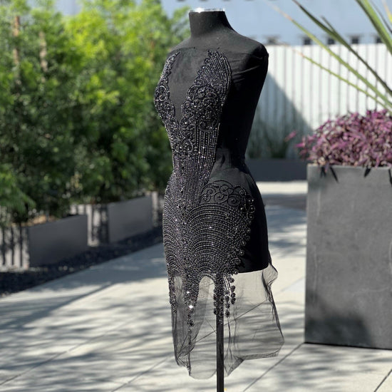 This one-piece bodice is attached to a nude mesh backing for easy use in DIY projects. Perfect for use on custom prom dresses, wedding and bridal dresses, formal dress occasions, and more.