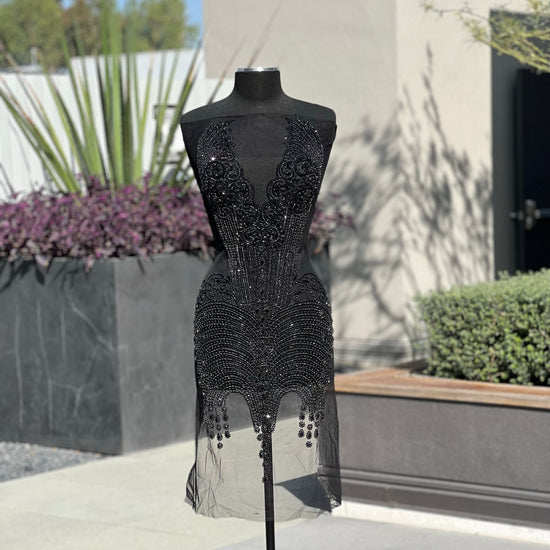 This one-piece bodice is attached to a nude mesh backing for easy use in DIY projects. Perfect for use on custom prom dresses, wedding and bridal dresses, formal dress occasions, and more.