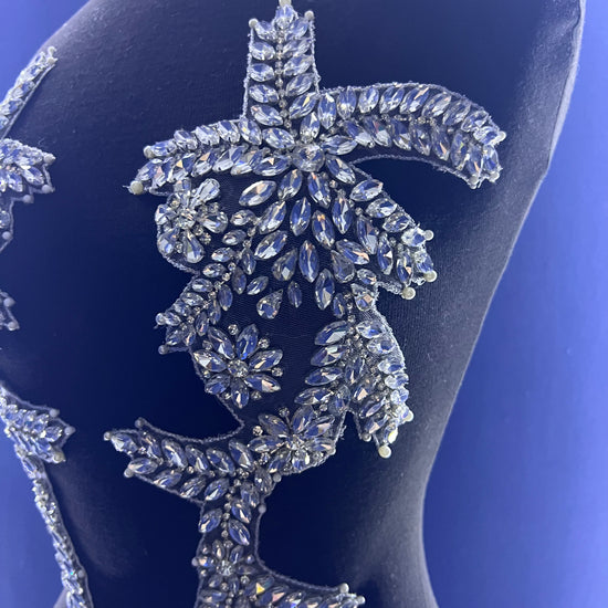 The Nikola rhinestone applique is handmade with high-quality crystal glass rhinestones. The mesh base allows for easy sewing for DIY projects. The applique can also easily be cut into smaller segments, with the use of scissors, for your own customized design.