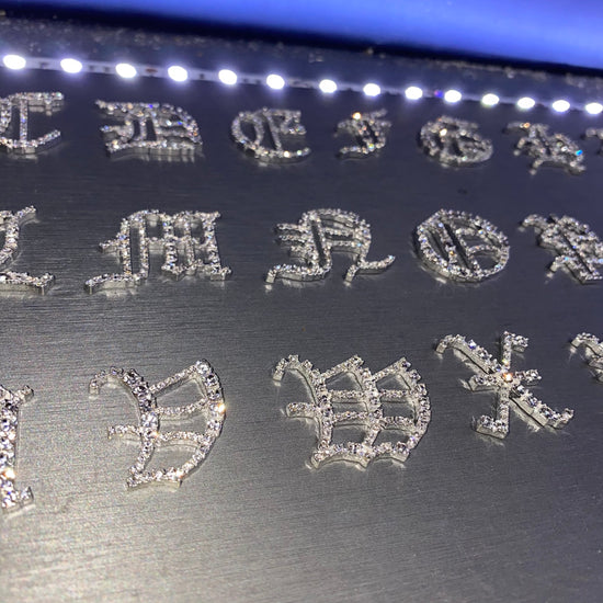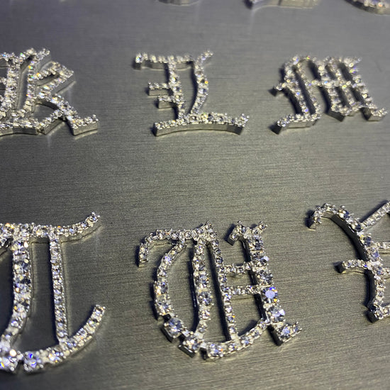 High-quality old English rhinestone letters, made with high-quality crystal rhinestones. Perfect for personalized projects and custom decals. Use on jackets, hats, hairpins, belts, wedding decor, hairbands, and more.