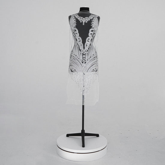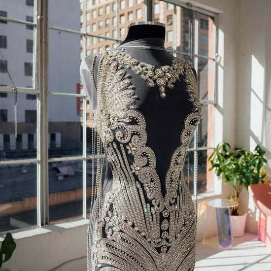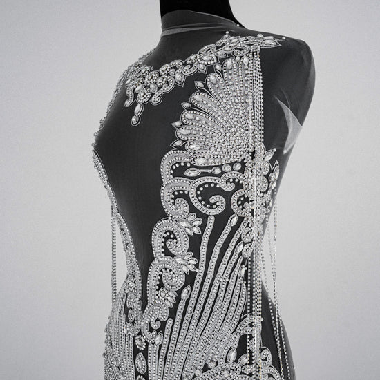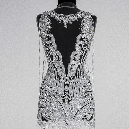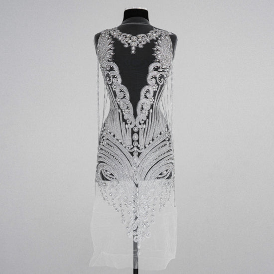 Beautiful beaded rhinestone bodice applique. This best-selling full-body applique is made with high-quality rhinestones in a gorgeous and lush design. The Rhinestone design is attached to a mesh backing for easy use in DIY projects. All items are ready to ship!