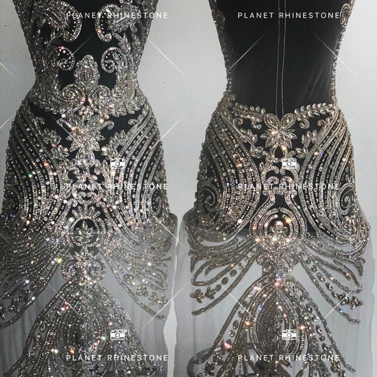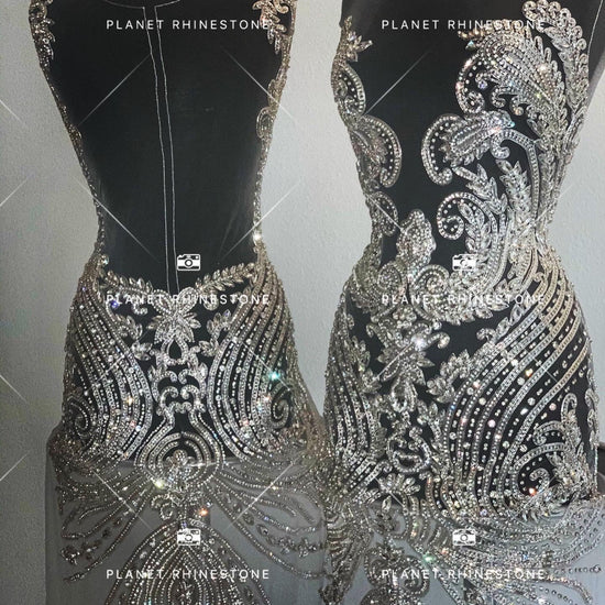 Beautiful beaded rhinestone bodice applique. This full-body applique is made with high-quality rhinestones in a gorgeous and lush design. This back and front set is attached to a mesh backing for easy use in DIY projects. All items are ready to ship!