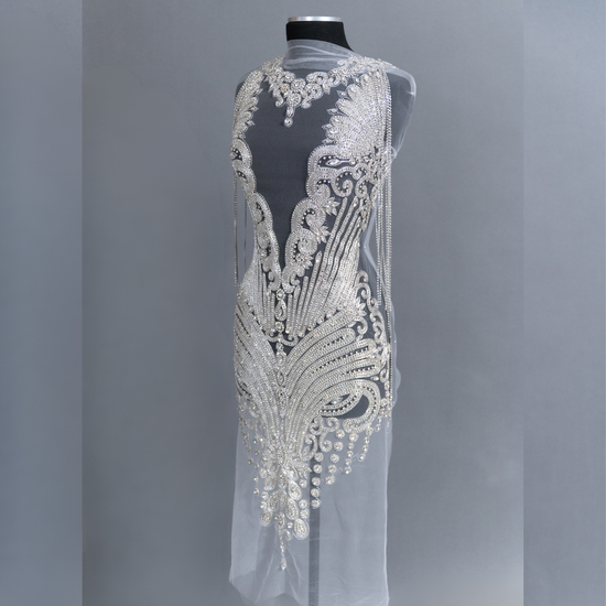 Beautiful beaded rhinestone bodice applique. This best-selling full-body applique is made with high-quality rhinestones in a gorgeous and lush design. This back and front set bodice is attached to a mesh backing for easy use in DIY projects. All items are ready to ship!