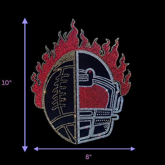Ignite your game day look with our Rhinestone Football Flame Design. This dazzling piece merges a football and helmet into one bold motif, surrounded by fiery rhinestone flames for maximum impact.