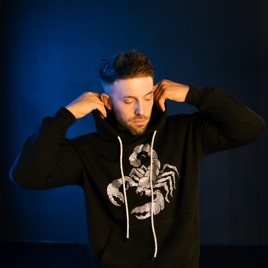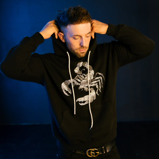 PRODUCT DETAILS: Our unisex Scorpion Hoodie features a large Scorpion design made of crystal glass rhinestones with a rhinestone hoodie drawstring.
