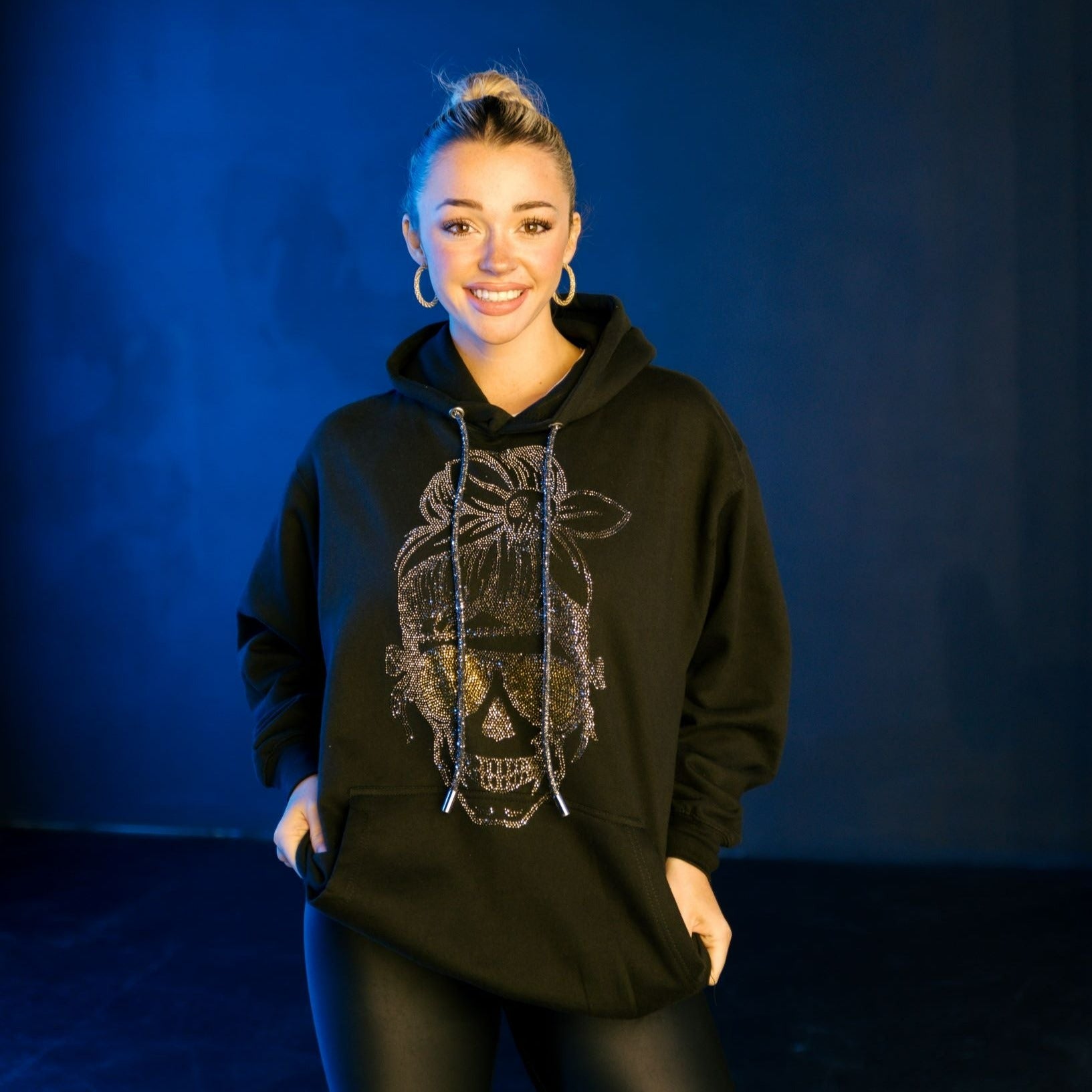 PRODUCT DETAILS: Our Skull Girl Hoodie is made with aurum glass rhinestones and a rhinestone hoodie drawstring.