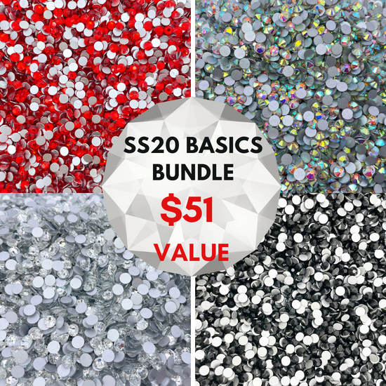 The SS20 (5MM) Glass Rhinestone Starter Bundle includes 4 packs of the basic rhinestone color everyone needs in their collection!