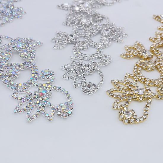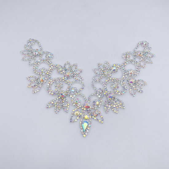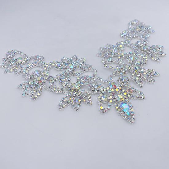 This unique applique is made of top-quality clear glass rhinestones. The flexible design allows you to use it as a sweetheart chest design or the applique can be straightened out and used as one continuous long design.