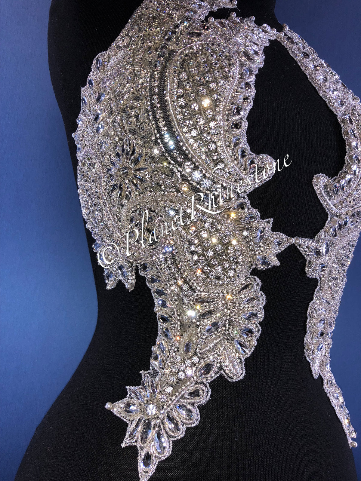 This beautiful applique is handmade with top quality Rhinestone beads. The applique is attached to a mesh backing to make it super easy for DIY projects. This applique can be used in many different styles and positions. What we have shown in the photo is our favorite look.