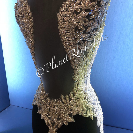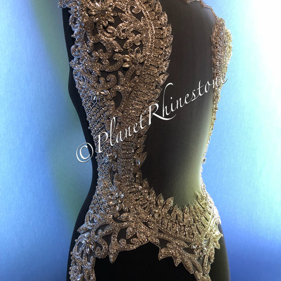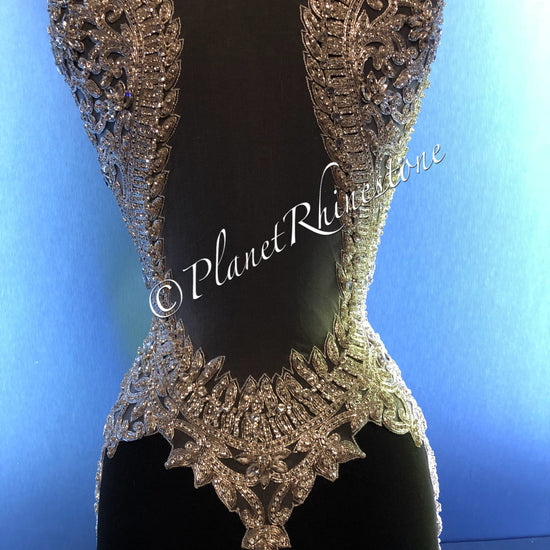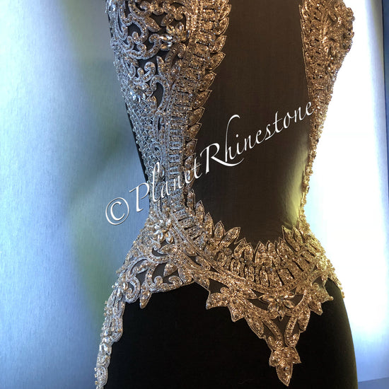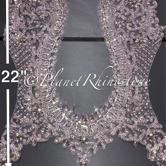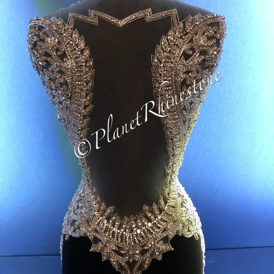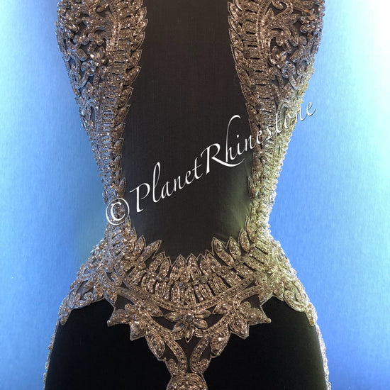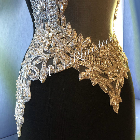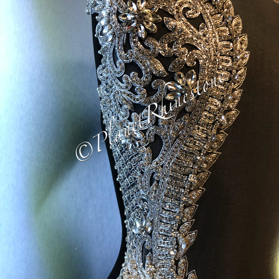 This beautiful applique is handmade with top quality Rhinestone beads. The applique is attached to a mesh backing to make it super easy for DIY projects. This applique can be used in many different styles and positions. What we have shown in the photo is our favorite look.